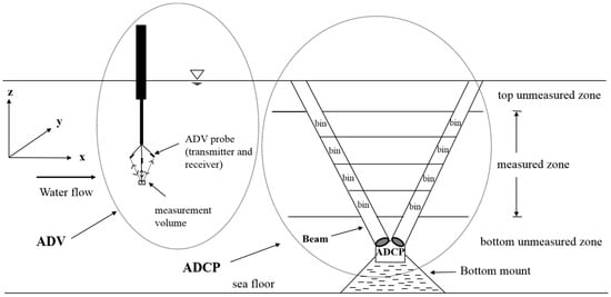 Schematic of an acoustic Doppler velocimeter (ADV) and typical bottom-mounted acoustic Doppler current profiler (ADCP) deployment.