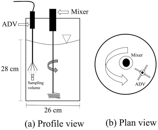A series of laboratory experiments was designed to investigate the relationship between suspended sediment concentration, sediment size and size distribution, and acoustic backscatter, using a 10 MHz Nortek acoustic Doppler velocimeter. The experiments were conducted in a laboratory using a simple set-up seen in Figure 2. A similar experimental apparatus was previously used in the lab successfully by the researchers studying on the subject, and it was shown that the set-up is capable of creating a high-level uniform suspension in the container [54,55]. An estimated maximum error of 0.5 cm in these dimensions translates to a maximum 1.8% error in water volume. All of the experiments were done with sand, and sand mass was measured to the nearest mg. The computed suspended sediment concentrations are thus known within 2%.