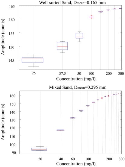 Raw backscatter amplitude vs. concentration for two experiments with well-sorted (top panel) and mixed (lower panel) sand samples. Each case was repeated six times for each tested concentration (the central mark is median, the edges of each box are the 25th and 75th percentiles, and the whiskers show extremes).