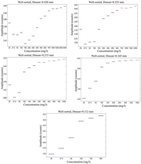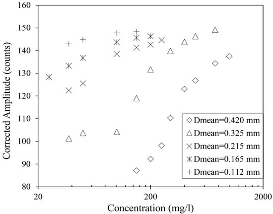 Acoustic instrument response varies by the size of the suspended particles. Each acoustic frequency has a particle size for which it possesses peak sensitivity and a minimum detectable particle diameter. Theoretically, the best results are obtained when D/2 × k = 1, i.e., the circumference of the particle is equal to λ, where D is the diameter of particle, and k is the wavenumber [53]. For the instrument used in this study, the corresponding wavelength λ is equal to 0.14 mm and the greatest sensitivity is expected for a particle diameter close to 0.045 mm, which is finer than the finest sieve used to sort the sediment used in the experiments.