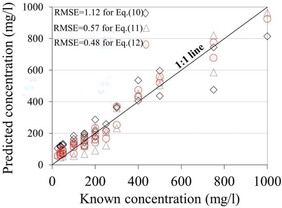 Predicted vs. known concentrations for the well-sorted sand fractions, with predictions computed using Equations (10)–(12). RMSE = Root-mean-square error from the 1:1 line.