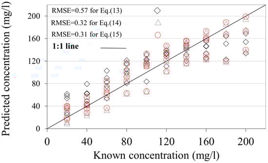 The results obtained with Equations (13)–(15) are shown in Figure 7. The results are similar for all three formulations, so the simpler form represented by (14) is preferable. Together, these results suggest that SSC predictions should be based on the first power of corrected backscatter amplitude, relative diameter, and coefficient of gradation. The results are weakly dependent on the coefficient of gradation, as revealed by each of Equations (13)–(15).