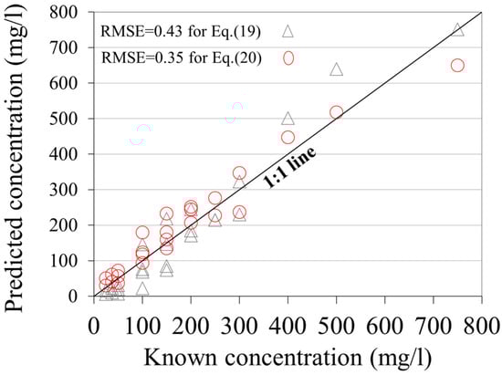 Predicted vs. known concentrations for mixed-sand cases, based on Equations (13)–(15). RMSE = Root-mean-square error from the 1:1 line.