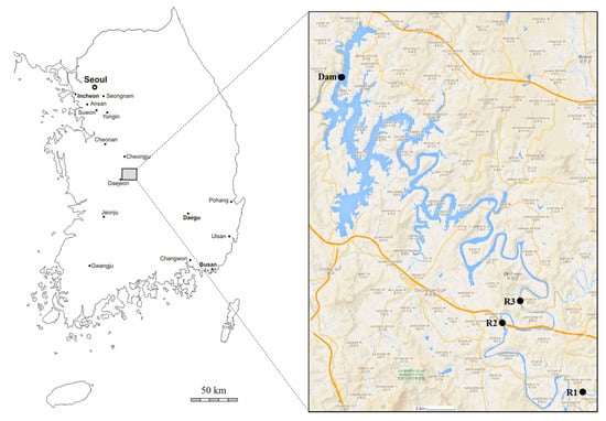 The Daecheong Reservoir spans an area of over 72.8 km2, runs for a length of 80 km, and has a maximum water storage volume of 1.5 billion tons. The reservoir is the third largest lake in Korea (Figure 1). It is used as a source of drinking water as well as for irrigation, hydropower generation, flood control, and fisheries [26]. The catchment area is 4166 km2, the land use of which consists of forest and hilly areas (74.5%), agricultural land such as rice paddies and other crops (16.3%), and urban areas (9.2%) [27]. Upstream, the river is joined by five major tributaries. The reservoir exhibits a dendritic drainage pattern (Figure 1). The catchment receives an annual average rainfall of 1400 mm, of which more than 50% is recorded during the summer monsoon months from July to September.