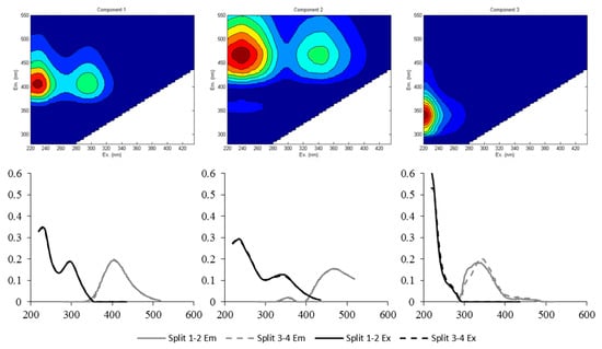 Contour plots of the three fluorescent components identified from excitation emission matrix-parallel factor analysis (EEM-PARAFAC). The emission (Em) and the excitation (Ex) loading are shown for the first and the second split-halves.