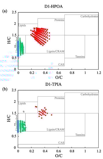 The relative abundances of the eight compounds classes, based on the molecular criteria presented in Table S2, were also compared for the different chemical fractions. Carbohydrates and tannins were the compound classes that were not detected or detected at a very low presence, irrespective of the chemical fractions. The low detection or absence of carbohydrate compounds could be constrained by the low ionization efficiency of polysaccharides in the negative ion mode during the FT-ICR MS analysis [54]. Meanwhile, tannins have been previously reported as potential missing compounds after SPE [55,56]. Except for the two compound classes, the distributions of the rest of the compound classes were consistent with previous observations and/or inferences from the fraction’s characteristics. For example, the most abundant molecular groups in the HPOA and the TPIA fractions were found to be unsaturated hydrocarbons (e.g., 43.1% ± 32.8% and 58.1% ± 14.9%, respectively), aromatic formulas (AF) (e.g., 32.5% ± 25.3% and 46.4% ± 10.0%, respectively) and lignin/CRAM (carboxyl-rich alicycyclic molecules) (e.g., 22.4% ± 35.7% and 20.9% ± 9.2%, respectively). The main differences between these two acidic fractions were in the abundances of condensed aromatic structures (CAS) (e.g., 0.5% ± 1.2% and 10.5% ± 9.0%, HPOA and TPIA respectively) and lipids (e.g., 28.5% ± 33.2% and 3.3% ± 1.3%, respectively). By contrast, the HPIN/B fraction presented a relatively high distributions of proteins (25.7% ± 7.5%) and lipids (29.4% ± 9.7%). This fraction also contains substantial amounts of lignin/CRAM (17.6% ± 4.6%), AF (14.5% ± 5.5%) and CAS (10.4% ± 10.9%). The overall distributions of the molecular groups among the different chemical fractions agreed with the general characteristics of the fractions previously reported in other studies [6,9].