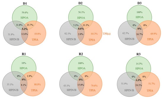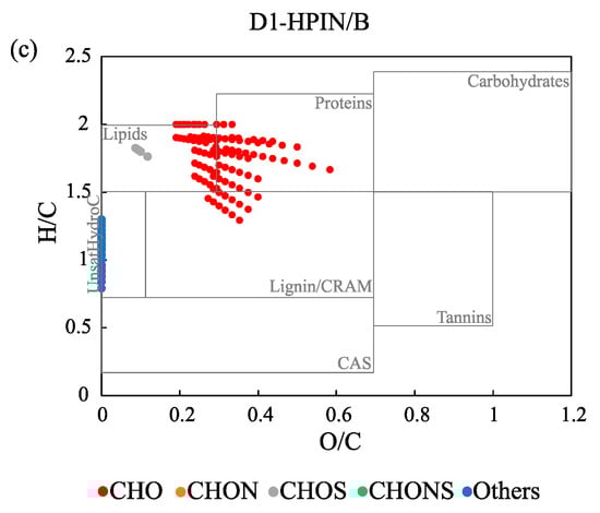 Lastly, a Venn diagram was created to highlight the molecular differences and to clarify the overlapped formulas between the three pairs of the different chemical fractions (e.g., HPOA, TPIA, and HPIN/B) for each sample (Figure 5). The diagrams demonstrated only small percentages in the number of the overlapped formulas among the three chemical fractions, ranging from 0% (D3, R1, and R2) to 5.2% only (D1), supporting the successful separation of the relatively homogeneous fractions (i.e., decreased chemical heterogeneity) of aquatic DOM samples through chemical fractionation. This result was consistent with those of Song et al. [6], in which <5% of formula overlapping was found for four different chemical fractions (i.e., hydrophobic neutrals and bases and amphiphilic neutrals and bases). For the river samples (i.e., R1, R2, and R3), HPOA was the most easily discriminated from the other two fractions with the low abundance of overlapped formulas (0% to 1.9%). Although the same formulas do not directly indicate a structural match (Song et al. [6]), the comparison of the overlapped formulas between the two chemical fractions revealed that aquatic HS (i.e., HPOA) with allochthonous sources might have a unique molecular composition distinguishable from the other chemical fractions obtained from the same DOM samples. Regarding the dam samples (i.e. D1, D2, and D3), the lowest abundance of overlapped formulas (e.g., ranging from 2.0% to 23.7%) was observed for the HPIN/B fraction (except for D3, the water obtained from the bottom of the dam). The differences observed for the river versus dam samples may relate to their origins (i.e., allochthonous vs. autochthonous). However, no significant differences were observed based on the fluorescence and the molecular parameters between each source pair (i.e., river vs. dam) for the same chemical fraction (Table S4).
