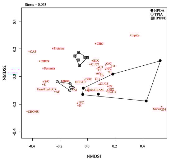 Using NMDS based on all selected parameters was another method to explore the relevant parameters to identify the three different chemical fractions (Figure 4). The stress value of the NMDS was 0.053, which is considered an excellent representation in reduced dimensions [58]. The three different chemical fractions were clustered and well separated on the map. A wide range of heterogeneity was found for the HPOA fraction (Figure 4), which had a high association with C2, HIX, C1/C3, C2/C3 and Lignin/CRAM. The TPIA fraction was mostly linked with only two molecular parameters, including the compound group “Others” and AI (Aromatic Index). Meanwhile, there was no particular parameter that can be directly related to the HPIN/B as shown by the absence of the parameters inside the boundary of the data points for the HPIN/B fraction in the map. The closest parameters to this fraction were the BIX and C1/C2 ratio (Figure 4). The distinction between the two acidic fractions, HPOA and TPIA, seems to be determined by their degree of aromaticity as the parameter of AI is placed between the two clusters in the map. In contrast, the distinction between the HPOA and HPIN/B fractions was mainly influenced by the distribution in elemental composition (C, H, O, H/C, O/C) and their refractory character (DBE), as well as by their source (FI, C3) and biological activity (BIX). By contrast, no parameters were located in between the TPIA and the HPIN/B fractions in the map.