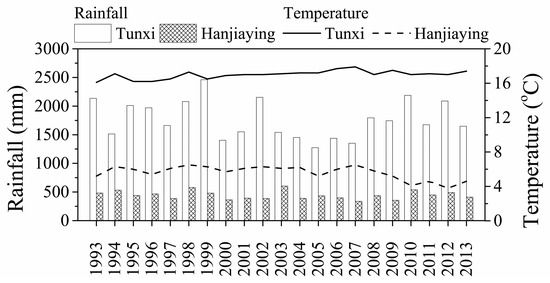 The study sites were chosen based on data availability and differences in climate, landuse and soil types (Figure 1). The Tunxi catchment is located in Anhui Province, which was selected to represent the humid south of China. It covers an area of approximately 2674 km2 with forest covering 74%, agriculture area 15.8%, urban 4.6% and others. Red soil (55%), paddy soil (13%), and purple soil (9.8%) are the predominant soil types. The basin had a subtropical humid monsoon climate with a mean annual temperature of 15.5 °C and a mean annual precipitation of 1752 mm during the period from 1993 to 2013. The daily temperature was always above 0 °C. The 6736 km2 of the Hanjiaying basin were selected as a representation of the semi-arid north of China. It is one of the largest subbasins of the Luan River watershed and located in Hebei Province, which is situated in the north of the Qinling Mountains-Huaihe River line. Forest (49%) and agricultural land (25%) are the major land uses within the basin. Brown soil (65%), and cinnamon soil (22%) are predominant in this watershed. The basin plays an important role for ecological servicing and water supply to the region. The climate is dominated by a temperate continental monsoon climate with a mean annual temperature of 5.62 °C and a mean annual precipitation of 446 mm from 1993 to 2013. Monthly mean temperatures range below 0 °C during the period from November to March and above 10 °C during the summer months (June–August).