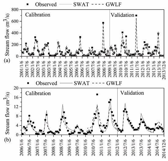The critical reason for why the performance of both models was highly consistent at the same site is that the same runoff calculating method (SCS CN) was utilized in both models. Furthermore, the distinctly different behavior between the Tunxi and Hanjiaying watersheds of both models indicates that the SCS is more suitable for areas with high flow. Some previous applications in areas with less runoff yielded relatively poor statistics. Shen et al. [54] obtained a NSE of 0.711 and 0.690 during calibration and validation periods for the monthly runoff of the Three Gorges Reservoir with mean monthly observed values below 0.05 m3/s. Parajuli et al. [28] obtained a NSE of 0.56 and a PBIAS of −95.06 in Red Rock Creek with normal flow volume below 1 m3/s. Li et al. [27] obtained a NSEs of 0.948 and 0.923, and REs of −0.071 and −0.084 during calibration and validation periods for the Heihe River basin in China with mean monthly observed runoff above 49 m3/s. Other publications reported that the performance of SWAT and GWLF in simulating low flows is not as useful as those of high or normal flows [22,55]. In fact, Chahinian et al. [56] compared four different infiltration-runoff models and all tested models had difficulties simulating low runoff events and even events characterized by a mild rainfall hiatus. Furthermore, the authors contributed this phenomenon to the absence of soil moisture re-distribution during flood events and to a constant value during the whole duration of the flood event.