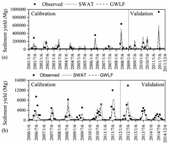 The similarity of the results of both models suggests that the difference between MUSLE and USLE is not apparent in simulating monthly sediment loads, which has previously been suggested [54]. The good representation and increased performance the SWAT model during calibration and validation periods may be attributed to the distributed property assessing spatial variations of the study sites. In Tunxi catchment, the consistent performance of GWLF was partially achieved due to its capability allowing sediment delivery ratio to be calibrated during different months. It simulated the peak values of sediment between April and July during calibration period reasonably, whereas it did not capture the peak values in February 2009 and March 2010 during validation periods. This indicates that the GWLF lacks adequate flexibility in case when evident difference exists between calibration and validation observed data, mainly due to its simple sediment parameters. Furthermore, errors of manual measurement and adaption of empirical calculating equation could also affect the performance of sediment in both models.