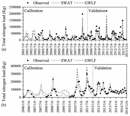 Based on the comparison above, the SWAT model was capable of providing a reasonable and reliable prediction of monthly TN loadings especially in the Hanjiaying watershed where measured data were scarce. Several published studies verified the robustness of SWAT in representing nitrogen loadings. Stewart et al. [19] used SWAT to predict water quality changes in Texas, reporting a very good correlation (R2 = 0.89, 0.87) and good agreement (NS = 0.71, 0.73) of monthly organic nitrogen in calibration and validation periods. Jha et al. [58] reported that SWAT performed very well on annual and monthly nutrient predictions in the Raccoon River watershed during the simulation periods with R2 and NSE exceeding 0.7 in most cases. Gassman et al. [10] summarized more than twenty peer-reviewed articles and the values for R2 and NSE mostly exceeded 0.5, indicating that the SWAT model is able to replicate a wide range of observed in-stream pollutant levels. This is due to SWAT considering five different chemical forms of nitrogen as well as the mutual transformation between them in the nitrogen cycle. However, GWLF only considers two different physical forms of nitrogen and does not take the conversion between them into account. Furthermore, the nitrogen concentrations remain constant during the whole model operating time. Thus, the accuracy achieved by GWLF is heavily dependent on the efficacy of calibration, which perhaps results in its poor performance in the Hanjiaying watershed where the measured data were limited. Furthermore, the value of CMD was higher in the Tunxi watershed than in Hanjiaying, indicating that microbial activity tended to be higher in this humid and warm area. In addition, the higher SHALLST_N of SWAT and nitrogen concentrations in sediment and groundwater of GWLF indicate that Hanjiaying suffers more human intervention than Tunxi. Actually, Hanjiaying has more agricultural land than Tunxi. This perhaps contributed to the relatively degraded performance of both models for the Hanjiaying watershed.