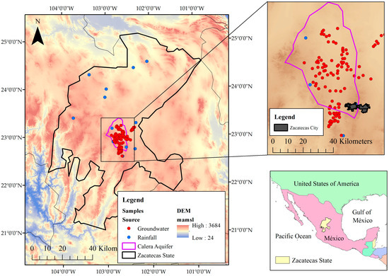 The Mexican state of Zacatecas is located at the central-northern part of the country; as a semiarid region, it is characterized by low rainfall values and consequently low surface runoff, but industrial activity and agricultural irrigation take place. In this region, groundwater is the main source that sustains economic development. The climate in Zacatecas is mainly arid, and half of the population lives in rural areas; therefore, irrigated agriculture is one of the most profitable economic activities. According to CONAGUA (National Commission of Water) [16], over 130 thousand hectares are irrigated with an annual volume of 330 hm3, producing annual groundwater levels drawdowns from 1 to 5 m, due in large part to rudimentary and outdated irrigation systems with efficiencies below 45%. This fact together with the incipient increase in population has caused a higher rate of water extraction to satisfy the demand for food and services [17]. The Calera aquifer is located in the central zone of the Zacatecas state, and has an area of 2087.6 km2, with a mean rainfall of 450 mm/year, resulting from a rainy season that occurs mainly between June and September and a potential evapotranspiration of 1900 mm/year. This aquifer is the main source of fresh water for agricultural and industrial activities, with an annual mean extraction of 125 mm3 [18]. The general map of the study area is shown in Figure 1.
