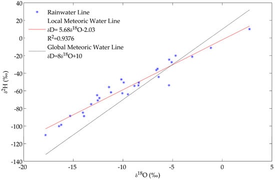 Precipitation is an important collector of the major and minor pollutants present in the atmosphere; furthermore, it is an important component of total water resources, making it vital for irrigation, human use, as well as industrial and domestic purposes in inland regions [2,3]. The chemical composition of rainfall is determined by several mechanisms: the condensation of water vapor on cloud condensation nuclei, the capture of species inside the cloud droplets (rainout), and scavenging processes below the clouds (washout) [4,5]. Particularly, there are two factors that control the isotopic character of rainfall: (a) the temperature of condensation of the precipitation and (b) the ratio of water vapor that has already condensed into precipitation to the initial amount of water vapor in the air mass. Nevertheless, other factors such as altitude, latitude, inland distance along different storm tracks, environmental conditions at the source of the vapor, and humidity also influence the isotopic composition of precipitation [1]. Oxygen and hydrogen isotopes ( and ) can be used to determine the source of groundwater and surface waters; in nature, there is a similar systematic isotopic fractionation of stable hydrogen and oxygen; thus, their behavior in the hydrologic cycle is also similar. This similarity rises to a covariance between the stable hydrogen and oxygen isotopic concentration; the covariance was defined by Craig [6] as follows: