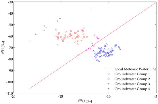 The stable isotope composition of groundwater reflects that precipitation in the recharge area seeps through the soil and the unsaturated zone to reach the water table. The potential infiltration of precipitation (only rain falling above a certain threshold rate contributes to recharge) into the soil and the unsaturated zone is, in principle, an isotopically non-fractionating process. In arid conditions, the movement of water can be upwards: water moves up in liquid and vapor phases in the unsaturated zone, eventually reaching the land surface to be lost as evaporation in the atmosphere [8]. Groundwater samples were obtained for a specific zone of Zacatecas, specifically around and within the Calera aquifer. The isotopic signatures of 115 samples of groundwater in and around the Calera aquifer were analyzed; the data are presented in the Supplementary File. The of groundwater ranged between −81.92‰ and −36.45‰, with a mean of −66.05‰ 8.58‰. The ranged between −18.26‰ and −8.84‰, with a mean of −12.35‰ 2.12‰. The ranged between −0.85‰ and 82.94‰, with a mean of 32.76‰ 23.71‰. There are different multivariate methods to group the samples; one widely-used method is the Hierarchical Cluster Analysis (HCA) approach, which has been used in the clustering of groundwater samples by several investigations [24,25,26]. Nevertheless, the groundwater samples in this study are clustered into four groups. These groups were established with respect to the distance from the LMWL (see Figure 3).