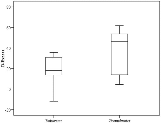 The isotopic composition of moisture in the marine atmosphere is controlled by air-sea interaction processes, and the d-excess value is fixed by these processes [27]. Figure 4 shows the statistical summaries of the d-excess values of rainwater and groundwater in the study area. The deuterium excess in precipitation and atmospheric water vapor provide information on the role of diffusive transport in the boundary layer at the evaporative source and on source temperatures that cannot be obtained from or individually available [28]. Rainwater samples in the study area present suggested d-excess values in the range of −11.81‰ and 35.80‰, with an average of 19.88‰. Of all the samples, 82.75% presented d-excess values higher than 10, which suggests the probable inputs of recycling water vapor and the contribution of possible surface flows to the rain clouds according to Fynn [29], where it was also established that low d-excess values may also have been derived from isolated local moist air masses having those characteristics. The d-excess value is a function of several factors, such as the temperature, humidity, and the isotopic characteristics of the ambient water vapor and the evaporating water.