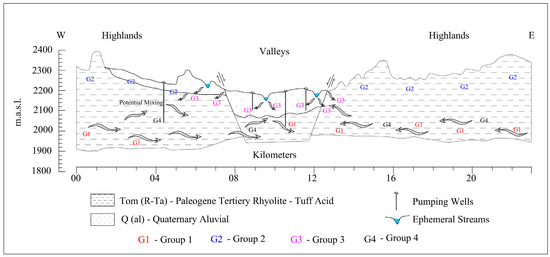 Based on the isotopic composition of groundwater and clustering, a regional geochemical conceptual model (Figure 6) was proposed along a representative cross-section of the study area. The flow patterns are presented, and different hydrogeologic environments are represented with their associated clusters. The Paleogene tertiary rhyolite allows the movement of water through the fractures; moreover, the rhyolite is covered by quaternary alluvial. The composition of the groundwater from wells settled and close to ephemeral streams is close to the rainwater composition.