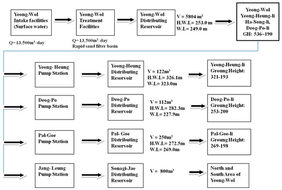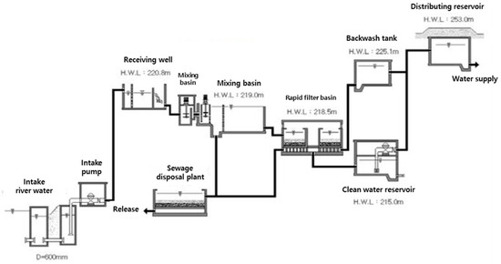 Water supply systems are largely divided, according to the functions of the facilities, into water intake facilities, water conveyance facilities, water treatment facilities, water transmission facilities, water supply facilities and water distribution facilities [24]. The scope of objective facilities is defined to include general civil engineering structures of each water supply system, pipe, pump, valve, machinery, MEP (mechanical, electrical, plumbing) facilities such as electronic and instrumentation/control devices, and other accessory equipment.