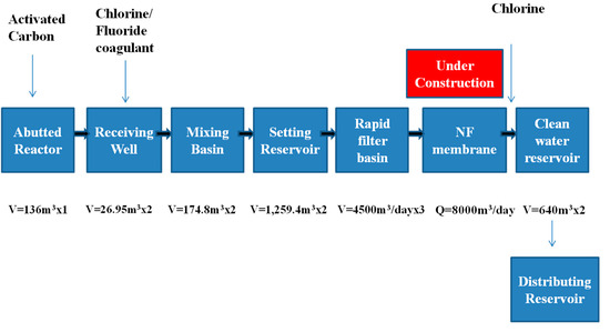 Figure 3 shows the water treatment chart of the YW pipeline system. The layout plans of the YW water intake facility and the YW water treatment facility are as shown below, and the location of the main facilities are also illustrated in Figure 4.