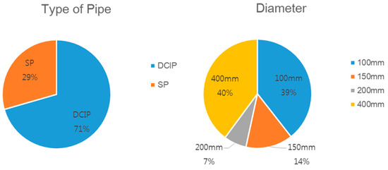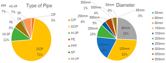There were various kind of pipes such as Cast iron pipe (CIP), Ductile cast iron pipe (DCIP), Polycarbonate (PC) and Polyethylene (PE), and especially DCIP accounted for 59% of the pipes used in the facilities. Pipes of different diameters were used, and those ranging from 150 mm to 600 mm took up 53% of the pipes used in the facilities as shown in Figure 5.