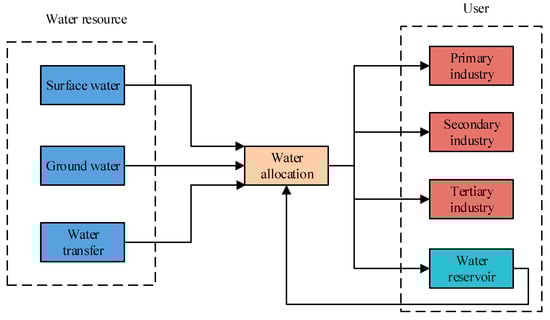 As an important natural resource, water is vital for supporting regional economic development and improving human-beings’ quality of life in densely populated areas (i.e., urban areas). In the last twenty years, with socioeconomic development, the acceleration of the urbanization process, and increasing population, water consumption has been obviously increasing in urban areas. In the past decades, water shortage problems have been relieved to a certain degree through protecting the existing water resources and exploiting new water resources. Nevertheless, due to the continuously increasing water demand and decreasing available water resources, the above two measures are becoming invalid [1]. Simultaneously, water shortage has seriously hindered the sustainable development of the Primary, Secondary, and Tertiary industry, which would pose a threat to social security and stability. In addition, there are still a variety of uncertainties existing in the water resources management system, such as available water amount, water consumption, multiple water sources, water conflicted users, and technical–economic parameters [2]. These uncertain factors could be an obstacle to the formulation of rational water resources utilization, and lead to conflict-laden water allocation among multiple competing users [3]. Therefore, the development of effective water resources management and protection schemes is desired in urban areas under uncertainty.