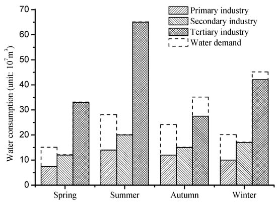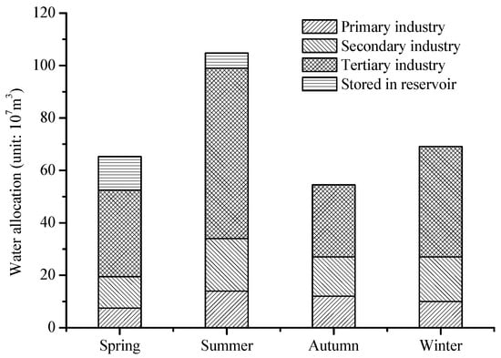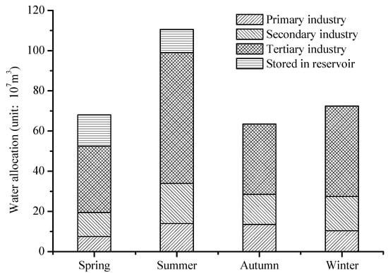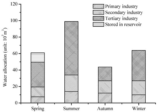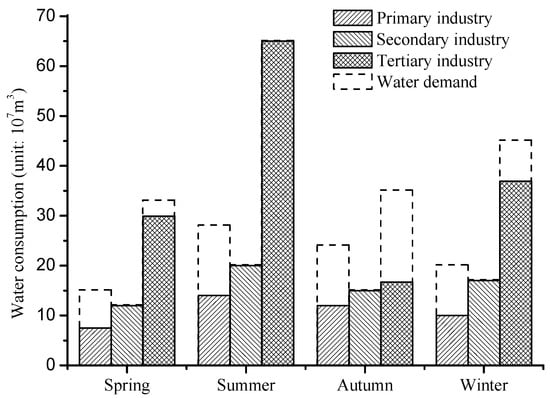 Figure 2 indicates that the water consumption of the tertiary industry should be favored in the second quarter. This is because the highest profits would be generated by the Tertiary industry when its water demand can be satisfied; meanwhile, it would suffer the highest penalty if the water demand could not be delivered. In comparison, the Secondary industry and the Primary industry would correspond to relatively lower profits and lower penalties. To allocate water to the Tertiary industry, the benefits (e.g., tourism) may be much more significant during summer [29]. As shown in Figure 3 and Figure 4, priority should be given to the water consumption of the Secondary industry in the third quarter. Because the Tertiary industry’s penalty caused by a lack of water is reduced significantly, the water supply should give priority to the Secondary industry and lastly to the Primary industry.