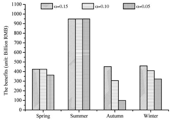 Figure 8 shows that regardless of the probabilities of violating constraints α, the benefit in summer is always the most; the decision-makers should give priority to water supply in summer.