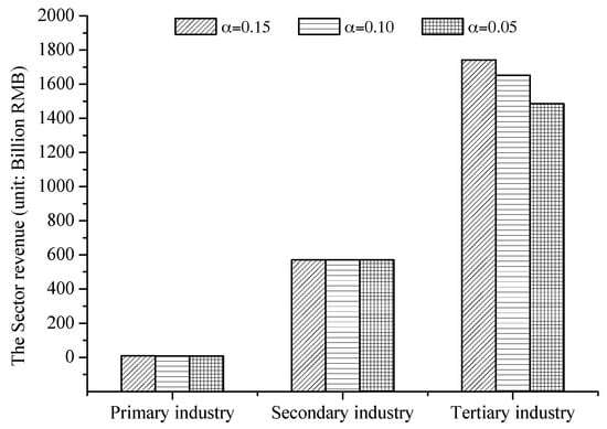 Under drought conditions, available water resources would reduce. As shown in Figure 4, the amount of water supply in the Tertiary industry would decrease. The Primary industry and the Secondary industry would not change in water supply. As shown in Table 8, a lower violating constraint would lead to relatively lower benefits. In the case of , the optimal net benefit is 2064.8 billion RMB. Although a lower violating constraint would result in a lower risk of water shortage, there would be a potential waste of water resources when the level of obtainable water flow is high.