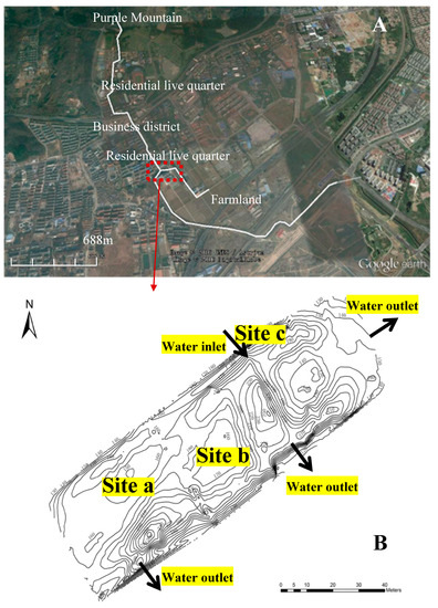 The tested water body was a severely eutrophic pond, which was located in Nanjing, Jiangsu, China. In Nanjing, a subtropical humid monsoon climate prevails, with high temperatures and rain in summer, and low temperatures, humidity and less rainy in winter. The annual precipitation of the city is 1060.4 mm on average. The temperature range is between −5 and 38 °C, with an annual average temperature of 15.6 °C. The region where the river channel flows through is shown in Figure 1A, and the specific pond (1.5–2.0 m depth, 5400 m2 water area) is located in the middle of the channel (Figure 1B); dry branches and fallen leaves floating in the running water of the Purple Mountain bring considerable organic matter and abundant nutrients to the pond after flowing through the business center and the residential living quarters. Affected by the surrounding domestic sewage, industrial wastewater or pollution from agricultural fertilizers, the pond has always been in a eutrophic condition, causing a blue-green algal bloom during the spring and summer season. The total nitrogen (TN) and total phosphorus (TP) contents in water body are higher than 2.0 and 0.2 mg L−1, respectively, throughout the year.