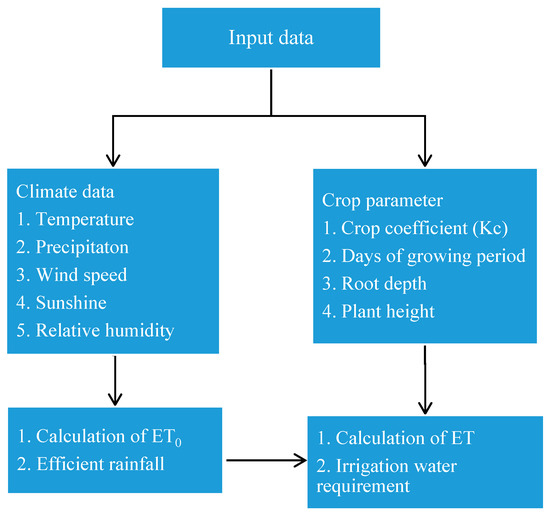 The calculation of agricultural water requirements is usually based on the measurement of evaporation or evapotranspiration (ET), using various methods [8]. First, ET is obtained based on ground experiment or observation, such as the energy budget (Bowen Ratio, the eddy covariance) method [7,9,10]. Second, some models are used to estimate ET such as the Two-Source Energy Balance Model or the CROPWAT model [7,8,10,11,12,13,14]. Of these, the CROPWAT model is a reliable model to calculate ET [7]. This model has been provided by the United Nations Food and Agriculture Organization (FAO) and can directly output the ET and irrigation water requirements of crops [15].