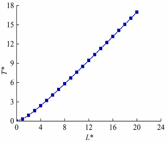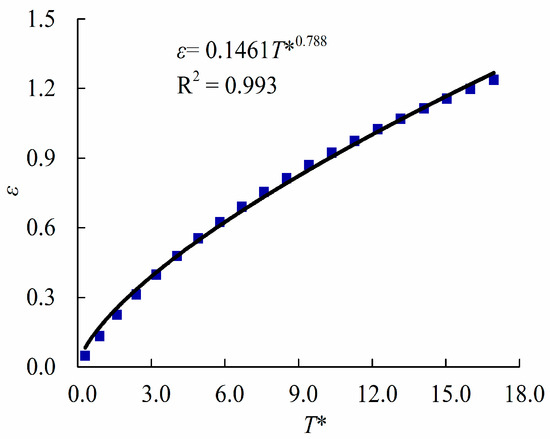 As displayed in Figure 2, the portion of the single relationship of ε versus T* can be approximated using a least-square curve fitting technique by substituting the power term [13]. Regarding the goodness of fit between the dimensionless ε versus T*, the coefficient of determination (R2) from the regressions was 0.993 for the range of L* between 0 and 20. Substituting the power term of Figure 2 into Equation (15), Equation (15) can be written as