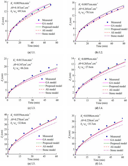 Laboratory experimental data were used to evaluate the four models explained in Section 2. The two data sets presented by Fok and Chiang [34] for Makiki clay under different initial soil moisture levels (i.e., dry and wet) were used in this study. For dry soil samples, Ks, h0 + ψm, and ∆θ were taken as 0.0039 cm min−1, 69.3 cm, and 0.187 cm3 cm−3, respectively, whereas values of 0.0057 cm min−1, 70.1 cm, and 0.265 cm3 cm−3 were used for wet soil samples. The details of the infiltration laboratory experiments for dry and wet soils are available in [34]. Another four 1D vertical infiltration data sets presented by Nie et al. [35] for clay loam and sandy loam were used in this study, and the infiltration time used was 60 min. During the infiltration process, the depth of ponding water was kept constant. The soil water characteristic curves and Ks were measured using a soil moisture suction meter (SXY-2, China) and an unsaturated hydraulic conductivity meter (FS-1, China), respectively. The value of ψm was determined using the method of Bautista et al. [29] according to the soil water characteristic parameters. Table 1 lists the details of the six laboratory experimental data sets.