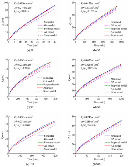 The GA model is an analytical solution derived from Darcy’s equation once some assumptions have been made, and it is derived indirectly through Richards’s model with some simplification [12]. The assumptions and simplification may have caused errors in the estimation of Zf. According to comparisons of the estimated values with the measured and simulated values, the largest RMSE, MAPRE, and PB values were 3.24 cm, 17.36%, and −14.03%, respectively, for the GA model (Table 4 and Table 5). These results indicated that the GA model can reliably estimate Zf with high accuracy, although its estimated value is slightly higher than that of the proposed model. However, the GA model is expressed by an implicit equation and is solved using an iterative method, which, to a certain extent, limits the application of the model [7,13,14].