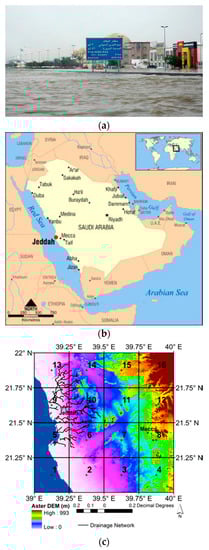 The vulnerability of arid and semi-arid regions to flash floods has been indicated to be equal to that of regions with heavy rain. Moreover, Zipser et al. [9] mentioned the occurrence of the strongest convective storms, and Haggag and El-Badry [10] indicated the rapid formation of flash floods in arid and semi-arid regions. The Kingdom of Saudi Arabia (KSA) is well known for its dry climatic conditions [11] and is classified as a semi-arid region [12,13]. However, the floods that occurred over Jeddah, Makkah and Riyadh in KSA indicate flash floods risks in the semi-arid kingdom (Figure 1a). The risks as well as the impact of flash floods increase due to the rainfall intensity and lack of mitigation implementations [11].