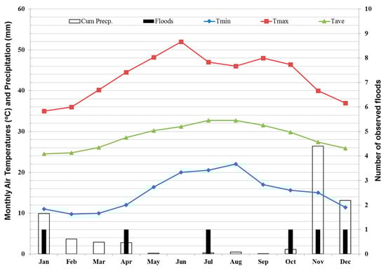 Monthly maximum, average and minimum air temperatures (°C), monthly cumulative precipitation (mm) and number of observed floods for Jeddah (Data source: https://en.wikipedia.org/wiki/Jeddah#Climate).