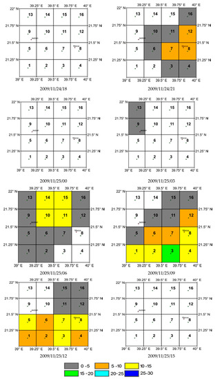 Usability of TRMM 3B42 data for water resource applications and high performance over KSA was demonstrated by Almazroi [33] and Kheimi and Gutub [34]. Tekeli and Fouli [35] indicated the capability of 3B42RT data in forecasting floods in Riyadh, KSA. Similar to Tekeli and Fouli [35] version 7 (V7) of 3B42RT data posted online in May of 2012 [36] is used here. Figure 3 presents TRMM 3B42RT pixel coverage over Jeddah. Despite Haggag and El-Badry [10] stating the underestimation of rainfall fields by TRMM 3B42 data, Figure 4 shows the flooding event on 25 November 2009 as detected by 3B42RT data. Details of TRMM 3B42RT data production algorithms can be obtained from the TRMM website [37], and data can be downloaded from the web address; https://pmm.nasa.gov/data-access/downloads/trmm.