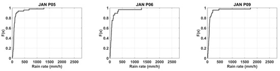 Cumulative distribution functions of 3B42RT pixels over Jeddah. P indicates the pixel numbers given in Figure 3. (Rain rates should be multiplied by 0.01).
