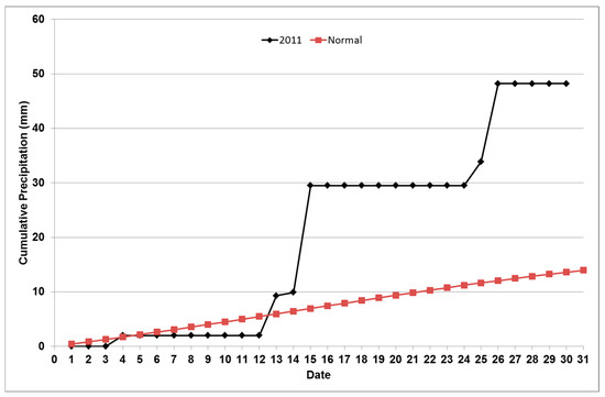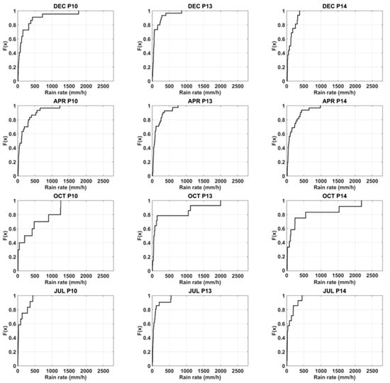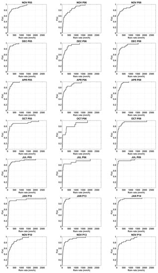 Three-hourly TRMM 3B42RT rainfall intensities over the pixels (pixels 5, 6, 9, 10, 13 and 14—See Figure 3) are aggregated monthly, pixel wise, and cumulative distribution functions (CDFs) are obtained for each pixel for each month. Figure 5 presents monthly CDFs covering the 2000–2014 period for the flood observed months.
