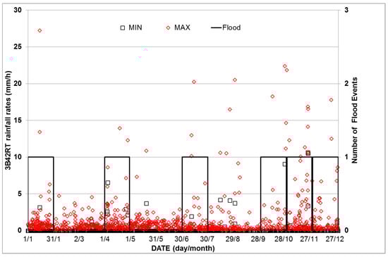 Flood events and minimum and maximum rainfall rates obtained from TRMM 3B42RT data are presented in Figure 6. High rainfall rates matched well with flood events except for August, during which no floods were reported. Moreover, both frequency and magnitude of the high rainfall rates are more common during the high rain season (November, December and January period). Thus, seasonality of rainfall patterns of Jeddah are also detected well by 3B42RT.