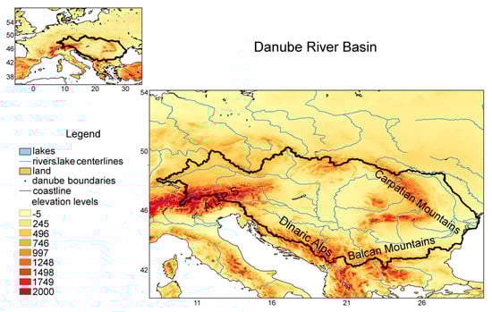 Extreme precipitation events in Central Europe, including the area inside of the Danube River Basin (DRB), have become very common in the last few decades and have usually been associated with related phenomena, such as flooding, landslides, storms, significant material damage and human sacrifices. One of the primary causes of extreme weather events may be a consequence of global climate changes []. It is known that climate change is one of the major causes of increasing temperatures, precipitation amounts and variability of precipitation events. The Danube River Basin has a very diverse climate and notably variable precipitation characteristics because of the proximity of the Atlantic Ocean, Mediterranean Sea and Alps mountain range []. Thus, the significant amount of precipitation in the basin area throughout the whole year may be due to the impact of these factors. When the annual precipitation scale is considered, it is clear that those months with the maximum amount of precipitation usually occur during the summer. This phenomenon is especially highlighted in the low-lying part of the Danube River Basin, where convective precipitation makes a significant contribution to the total amount of precipitation []. Conversely, the months with minimum precipitation occur in mid-winter (January and February), when the Asiatic region of high pressure disables the movement of air masses from the Atlantic to the east. The average value of annual precipitation for the Danube River Basin is estimated as 2300 mm in the high mountains and approximately 400 mm in the delta region. Precipitation values above 2000 mm appear in the Upper Danube Basin in the high Alpine regions and in the Central Danube Regions on the southern oriented mountain chains of the Julian Alps and Dinaric system (Figure 1), which are exposed to the influence of humid-warm air masses originating in the Mediterranean [,].