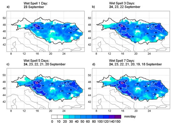 Accumulated precipitation (shaded, mm/day) for the 23 September 1996 wet spell event in duration of one, three, five and seven days, on the area of the DRB (Danube River Basin). White contour line corresponds to the accumulated precipitation amount of 100 and 150 mm/day. Daily data from CHIRPS in a 0.05° degree spatial resolution in latitude and longitude.