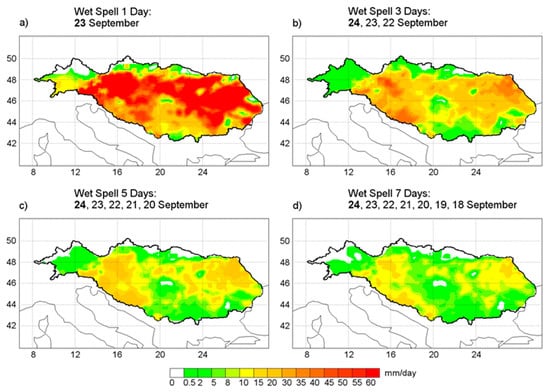 Figure 3 shows the mean daily precipitation anomalies for the Danube River Basin area for the whole period of the CHIRPS precipitation dataset for the 23 September 1996 wet spell event at durations of one, three, five and seven days. The largest positive precipitation anomalies are stressed for the wet spell events with shorter durations, one and three days (Figure 3a,b respectively), where the magnitude of the anomalies are in a range of 30 until more than 60 mm/day over the main area of the Danube River Basin. Wet spell events on the longer time scales (Figure 3c,d) also showed positive values of mean daily precipitation anomalies but with considerably less value, lower than 20 mm/day.