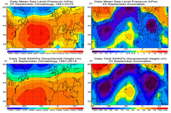 Top: Daily mean seal level pressure (SLP) for the day 23 September 1996 (measured in hPa). Bottom: Daily total geopotential height at 850 hPa, measured for the day 23 September 1996 (in geopotential metres, gpm). Left hand column (a,c) shows the climatology for 23 September 1981–2015 and right column (b,d) the anomalies. Data obtained from ERA-Interim at 1° degree in latitude and longitude.