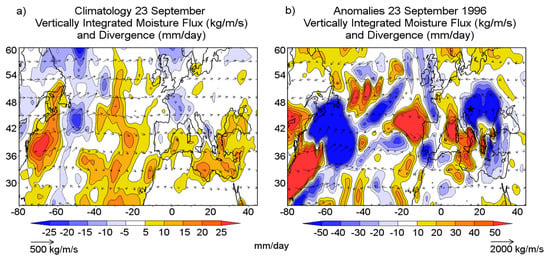 Left hand (a): Climatological daily mean Vertically Integrated Moisture Flux (VIMF) values for 23 September during the period 1981–2015. Right hand (b): Daily mean anomalies of VIMF values for the day 23 September 1996. Vectors measured in kg m−1 s−1 and respective divergence shaded and measured in mm day−1. The black asterisk marks the central position of the low. Data from ERA-Interim at 1° degree in latitude and longitude.