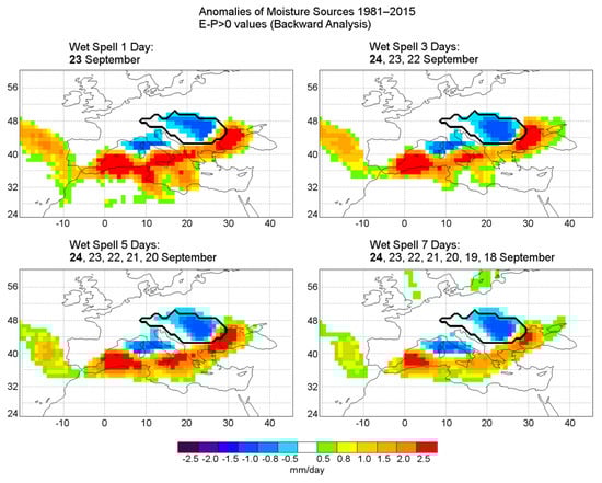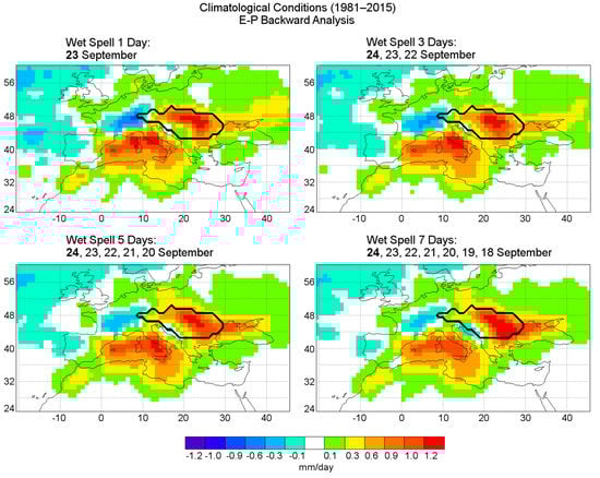 Once the top-ranked wet spell event was identified for the DRB and the meteorological situation, the next step was to investigate changes in the moisture transport during the lifetime of the extreme event using a Lagrangian approach. Figure 6 shows the mean climatological sources of moisture for the 1-day, 3-day, 5-day and 7-day lengths of the wet spell. The climatology is calculated using a 35-year period (1981–2015) obtained through backward trajectories from the Danube River Basin. The backward analysis allows us to track where the particles gain humidity during their trajectories towards the area of the Danube River Basin. The colours with positive values represent areas where evaporation is greater than precipitation (E − P) > 0; thus, these areas are moisture sources for the DRB. On the other hand, areas where precipitation is greater than evaporation are moisture sinks (E – P < 0). In Figure 6, these areas are marked with bluish colours that represent negative values. For the 1-day length, for instance, to compute the moisture climatological field, all of the values for 23 September along the 35 years are taken into account, and for the 3-day length, the three days involved (22–24 September) for the 35 years are taken into account. The moisture source patterns (Figure 6) for the wet spell event at the different time scales exhibit similar behaviour. For all plots of the regions that show the major positive values of (E − P), the moisture sources are the northern-central and western Mediterranean Sea, the Danube River Basin itself, and the northern and western Black Sea. This result is in concordance with a recently published paper [] in which the sources of moisture for the DRB were analysed in depth.