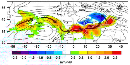 Anomalies of moisture sources (E − P > 0) obtained from the backward analysis during 10 days for the 23 September 1996 wet spell. SLP in black contours for 23 September 1996. Grey arrows indicate schematically the flow of the moisture from the Northern Atlantic Ocean to the DRB crossing the Mediterranean basin.