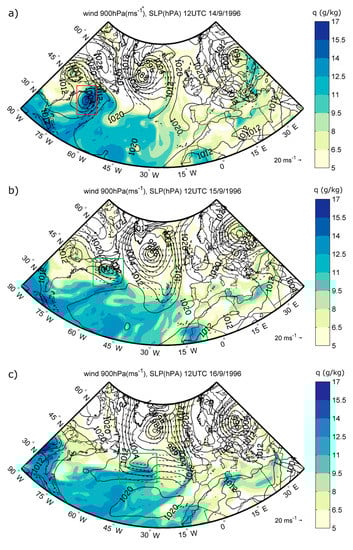 The wind field (vectors, m/s) and specific humidity (shaded, g/kg) at 900 hPa are shown along with the Sea Level Pressure (SLP, contours, hPa) on the (a) 14 September 1996 at 12 UTC; (b) 15 September 1996 at 12 UTC and (c) 16 September 1996 at 12 UTC. In addition, Hurricane Hortense is highlighted with a red square, while it’s extra-tropical transition is highlighted with a green square. Only winds speeds above 10 m/s are shown.