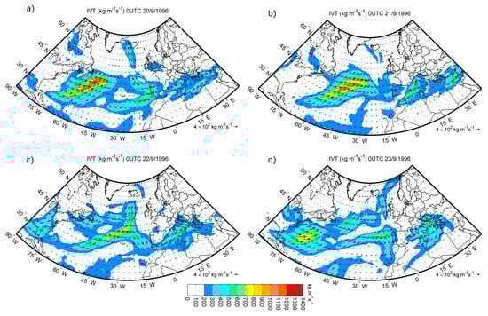 The extra tropical cyclone that occurs immediately after the Hortense (highlighted with the blue box on Supplementary Material Video S1) struck the Northwest Iberian Peninsula on 20 September 1996. Figure 10a shows that associated with it there was a long corridor of vertically integrated horizontal water vapour transport (IVT) with the characteristics of an Atmospheric River (AR) around 38.5ºN. ARs are relatively long, narrow regions in the atmosphere that transport most of the water vapour outside of the tropics, they contain high amounts of water vapour and they could be associated with extreme events in terms of rainfall and floods where they impact [,,]. In fact, the ERA-Interim ARs database developed by Ramos et al. [] for the Iberian Peninsula identifies this particular AR. Then, this fast corridor of moisture (but with lower intensity) penetrated the Mediterranean basin during the following day (Figure 10b), and on the 23 September 1996 (Figure 10d) the anomalous transport of moisture reached the Danube River Basin, associated with the low situated over our area of study. A close look at the global ARs database of Guan and Waliser [] indicates that this particular pattern of IVT along the Mediterranean and North Africa towards the Danube is also an AR event.