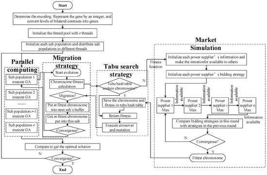The aforementioned algorithm enables policy makers to evaluate the effects of a certain level of bilateral contracts on the market operation situation by measuring CI. The optimal levels of bilateral contracts have to be found among many different plausible levels of bilateral contracts, which form a huge solution space for policy makers [25]. This is a complex, sequential, combinatorial optimization problem that can take a long time to solve because the optimal market regulation is based on the market simulation, which is, in turn, based on individual profit maximizations. The Genetic Algorithm (GA), a random intelligent optimization method, which can improve the computational efficiency. Since the GA is robust and adaptable, it has been widely used in different applications [26,27]. However, the possibility of getting trapped in local optima remains a general pitfall of conventional GA due to the difficulty of confirming the global optimality of the solutions. This issue can impose a limit on the application of GA to large-scale, complex optimization problems with very large solution spaces. Based on the problem mentioned before, the present study first solves the GA problem, starting from multi-subpopulations, to maintain the diversity of the population. Secondly, a migration strategy is adopted to exchange information between sub-populations in order to break the enclosed environment in case local optima are achieved. A cone topology model is used to migrate chromosomes between sub-populations, which takes both separations between sub-populations and the diversity of the global population into consideration. Thirdly, a tabu search strategy is introduced to increase the computation efficiency by avoiding calculating the same chromosome repeatedly through a tabu hash table. Finally, taking the advantage of the natural parallelism of GA by dividing the initial population into several sub-populations, multi-core parallel computing is used to further reduce the computation time. Figure 4 shows the schematic of this multi-core parallel computing strategy. It performs each sub-population’s genetic manipulation as a task, using a thread pool for task scheduling and the reasonable distribution of computing resources, (i.e., efficient use of the CPU resources) [27]. Above all, MPTGA is achieved to solve the proposed problem.