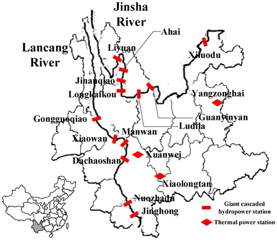 Locations of the giant cascaded hydropower stations and the thermal power stations in Yunnan.